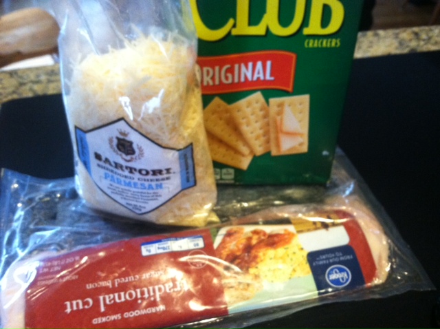 You will need a box of club crackers, a package of bacon (cut the slices in thirds) and shredded parmesan cheese (the fresher the better).