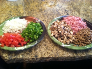Green peppers, onions, tomatoes, ham, sausage and mushrooms. Yum. If you use your imagination, you could pretend you are at some luxury all-inclusive hotel in Mexico and you are in the omelette line. 🙂 After placing a high-quality football themed paper plate in contestant #1’s hands, I directed them to the plates of ingredients to gather what they desired in their omelette. Saute in a little butter, add eggs and cheese, and you may want to come back for another!