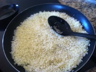 I started with a skillet at medium high heat, and added oil then rice to lightly brown it. This is a key step, but you have to be careful as it can burn really easily. Keep stirring and flipping it around, and once it’s mostly toasty start adding liquid and other ingredients.