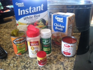This is the Rice Family Ingredients below, and they make it all come together. I added the whole green chiles during the cooking process for flavor and then removed them prior to serving. Onion and garlic powder, salt, cumin, chicken broth and tomato sauce wound up passing the hubster test.