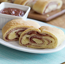 Stromboli is super easy and you can add what you like. We use pepperoni, and I like to buy turkey pepperoni because of the lesser fat content, and a good sliced lunchmeat ham. Layer away and it will be superb. I always offer up spaghetti or marinara sauce for dipping but I like it as is. Anytime. Anywhere. And if the recipe below works out for you it will somewhat mirror this, and oh man, grab it quick!