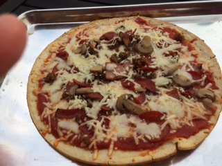 This is a fun way to personalize your own food, and everybody gets exactly what they want. To cook the pizzas, get your grill nice and hot, then oil the grates (we use a vegetable oil-soaked paper towel and rub the grates using tongs). Once you’re ready to cook the pizzas, turn one side off and cook the pizzas on that side checking the bottom crust frequently to make sure they don’t burn. Here’s the finished product that I ate: