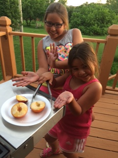 I bought a few peaches – not smushy but fairly ripe. Cut them in half with little help from my (our) friends (Beatles song 🙂 :