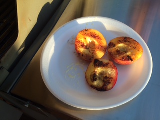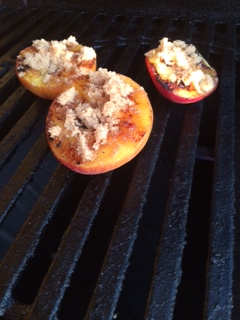 Cut peaches in half, and remove pits. Oh yeah, you might wanna wash them also. Brush or spray with butter, and place on low temp grill, face down. Grill until soft, but not smushy. Sprinkle about a TBSP of brown sugar in the well of the peach, and around the top, and then lightly add a cinnamon sprinkle. Back to the grill, face up with grill off. Sugar melts and delish! Eat as is, or serve with vanilla ice cream.