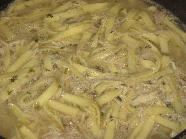 - Purchase a whole chicken, and simmer slowly with a bunch of onion, celery, carrots and seasoning. When chicken is done, remove from broth and let cool until you can debone it, or “pick” the chicken. When the broth cools, skim the fat and stuff from the top and run through a strainer. You will have delicious broth with which to cook your noodles. You can also do this with cut up chicken, chicken breasts, etc. The key is really seasoning the water as it cooks — you might also add some chicken stock to give the flavor a boost.