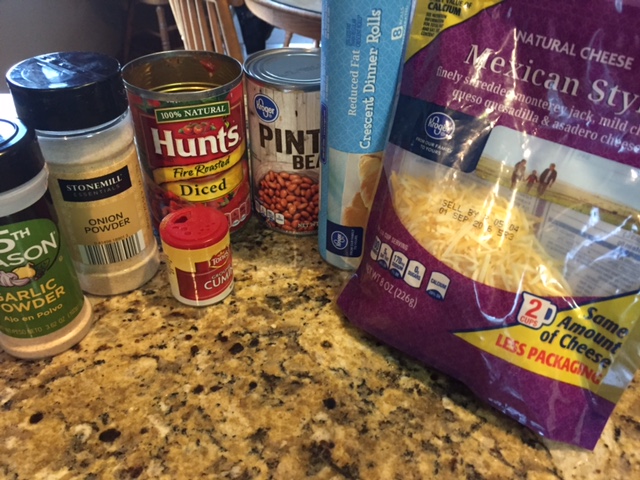I layered my bean/ground beef/roasted tomato mixture, and covered it with a mix of mexican-style shredded cheese. Topped off with fritos and folded the pointy ends of the rolls over, tucking them underneath. Brushing the top of the rolls with a beaten egg will help it brown nicely, with a very shiny pretty appearance. Voila: