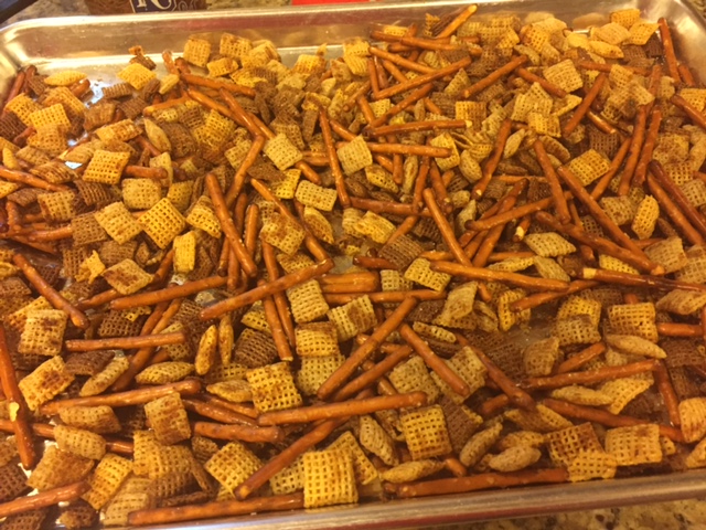 I am probably one of the few who have never made chex snack mix…not really sure why. But I recently observed and subsequently ate our son-in-law’s version, and oh man, it was delicious. It was strongly suggested today that I get the stuff so we can have some for the Chiefs game tonight, so I thought I would share here. Really easy and in an hour, bam, you’re good to go!!!