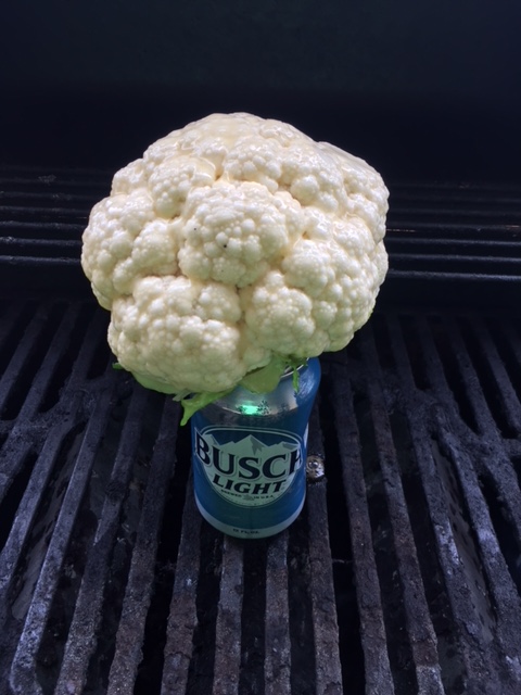 Yep folks, that what I said. Not chicken. I ran across this recipe and adapted it to fit what I thought we would like. Gotta be honest though, not really sure on the purpose of the beer can except to keep it elevated off of the grill. But hey, it looks really redneck and impressive, and you have to drink 1/4 of it prior to mounting the cauliflower, so we’ll call it good.